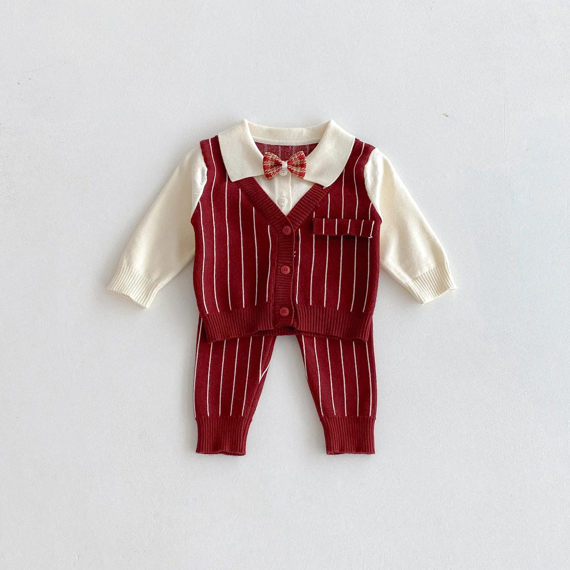 2025 Baby Clothes Toddler Baby Boy Knit Striped 3Pcs Sets 0-2Y Bow Tie Shirt and Pants Gentleman Casual Formal Infant Outfit