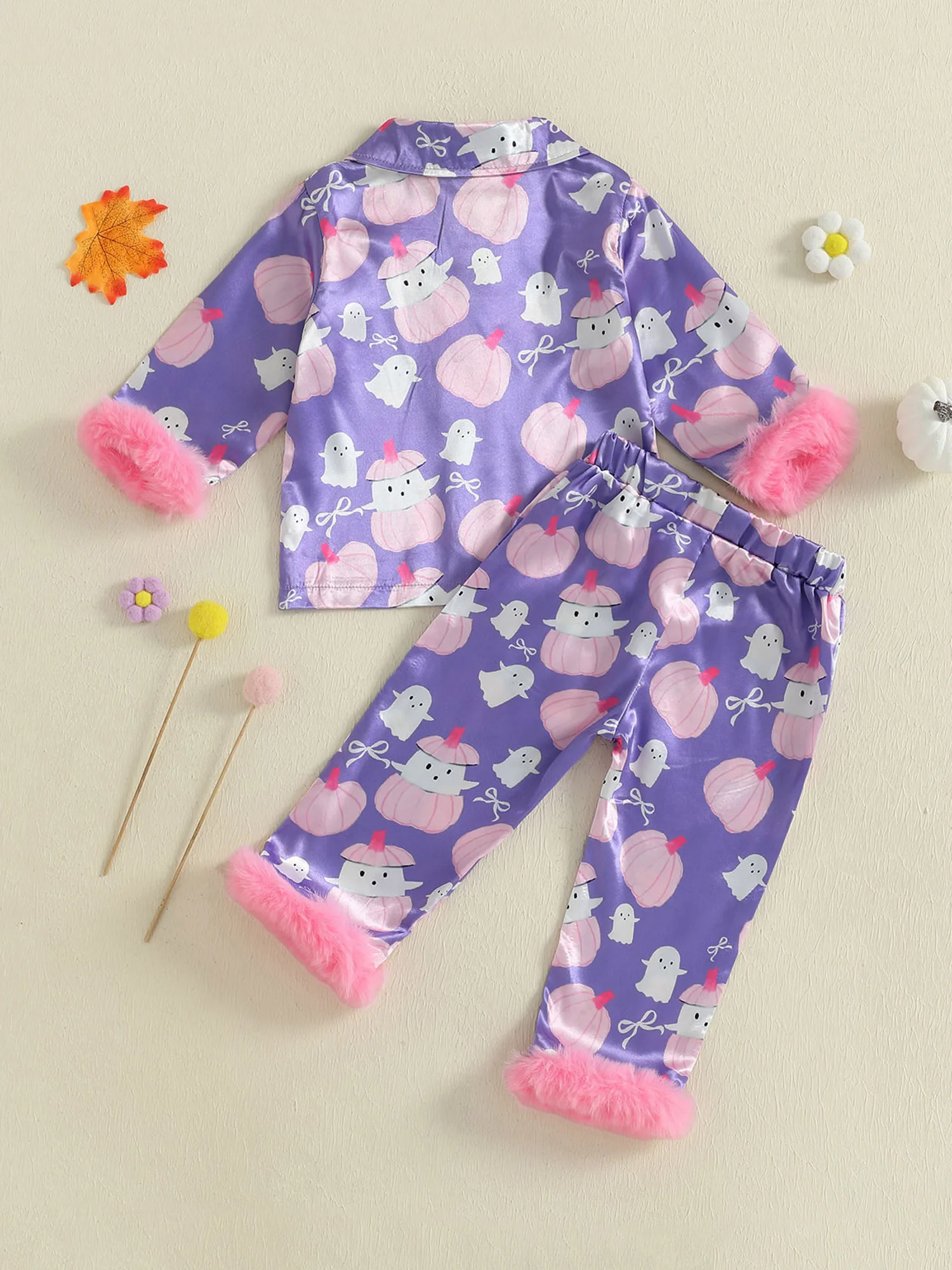 2Pcs Toddler Girls Halloween Pajamas Set Long Sleeve Fur Cuffs Button Down Shirts and Pants Set SleepwearFeatures: