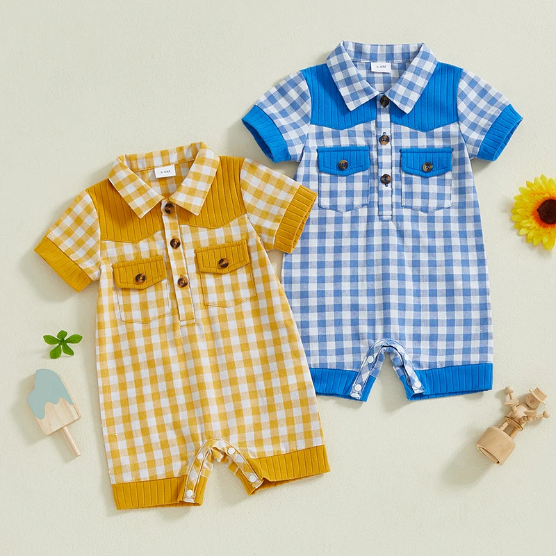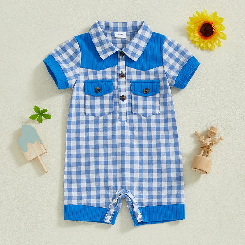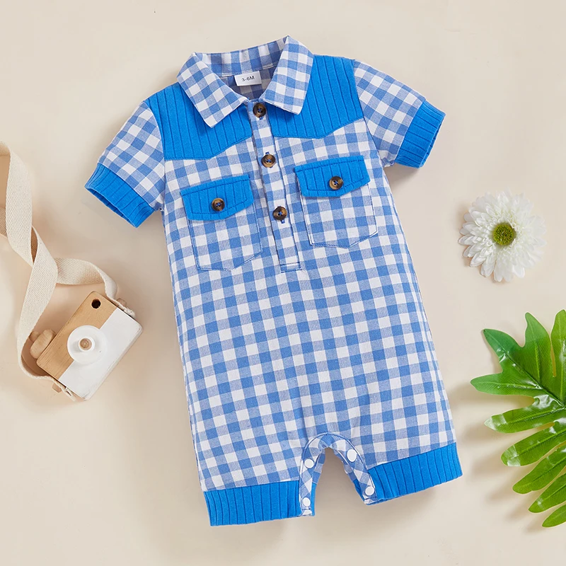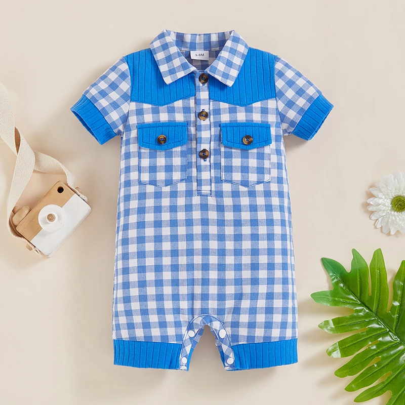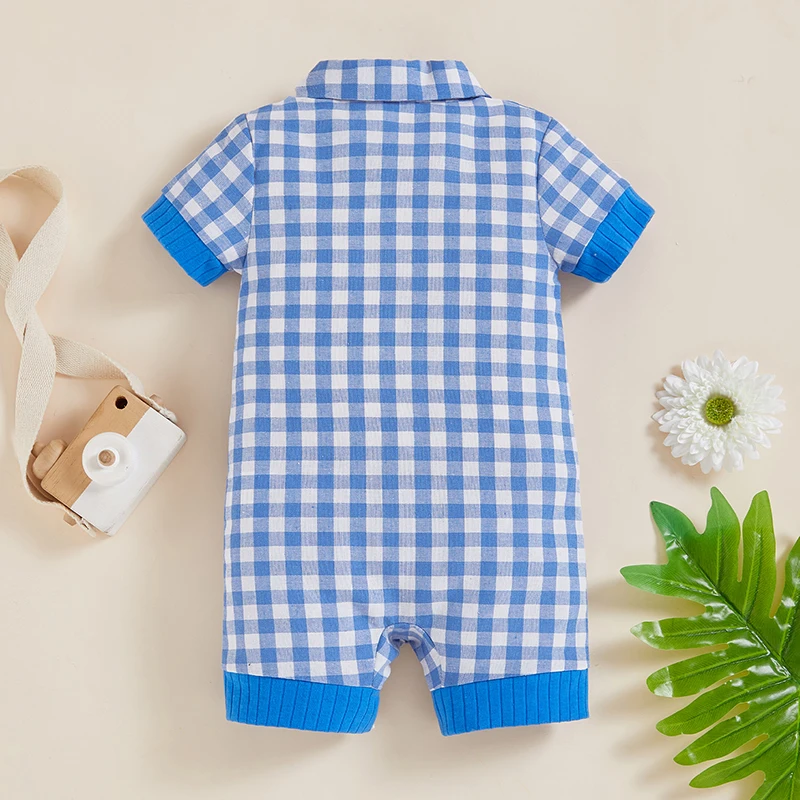 Adorable Infant Plaid Romper with Short Sleeves Lapel Collar and Button Front Closure - Perfect for Baby Boys and Girls this