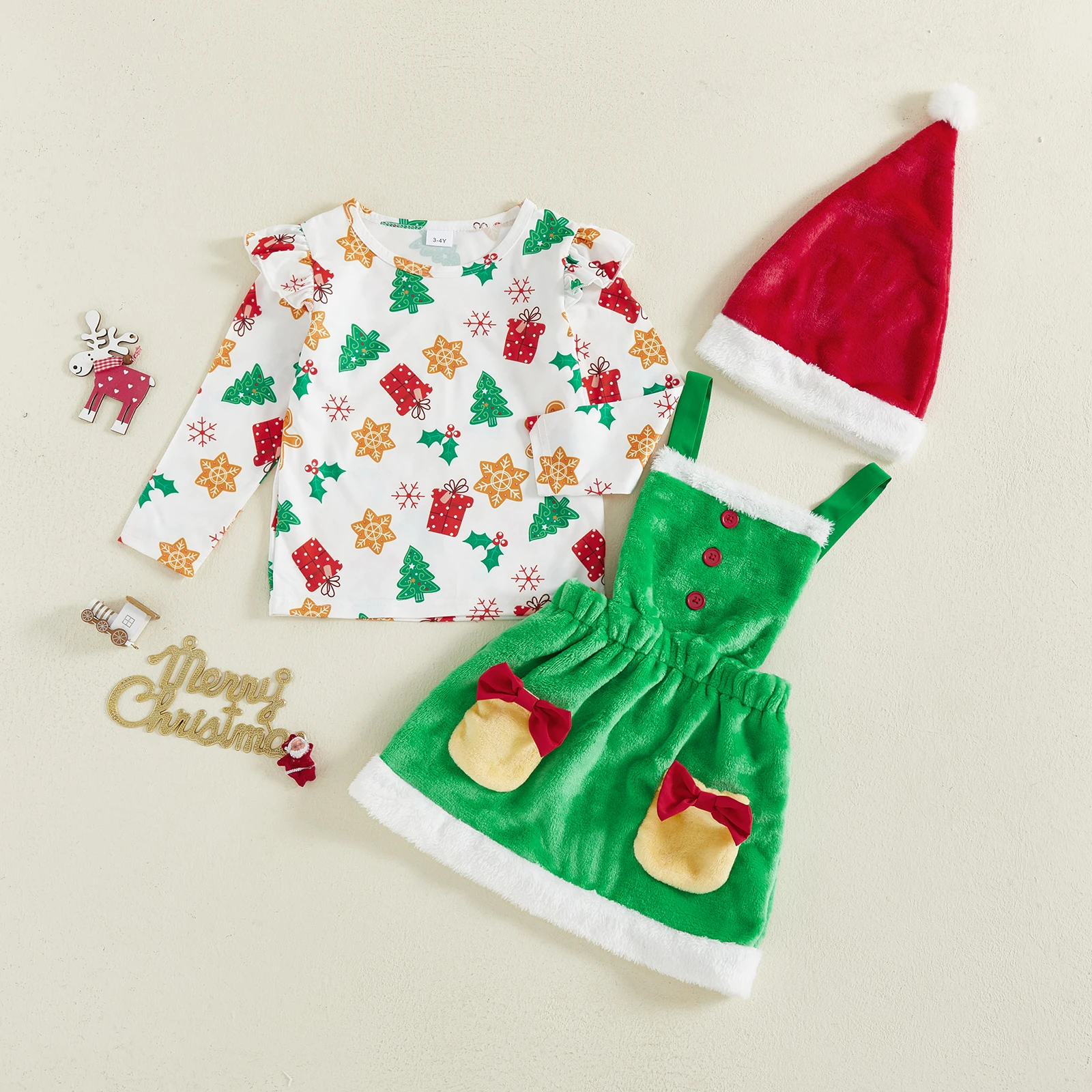 Kids Girls Christmas Outfit, Long Sleeve Tree Print T-shirt with Furry Slip Dress Winter Outfit