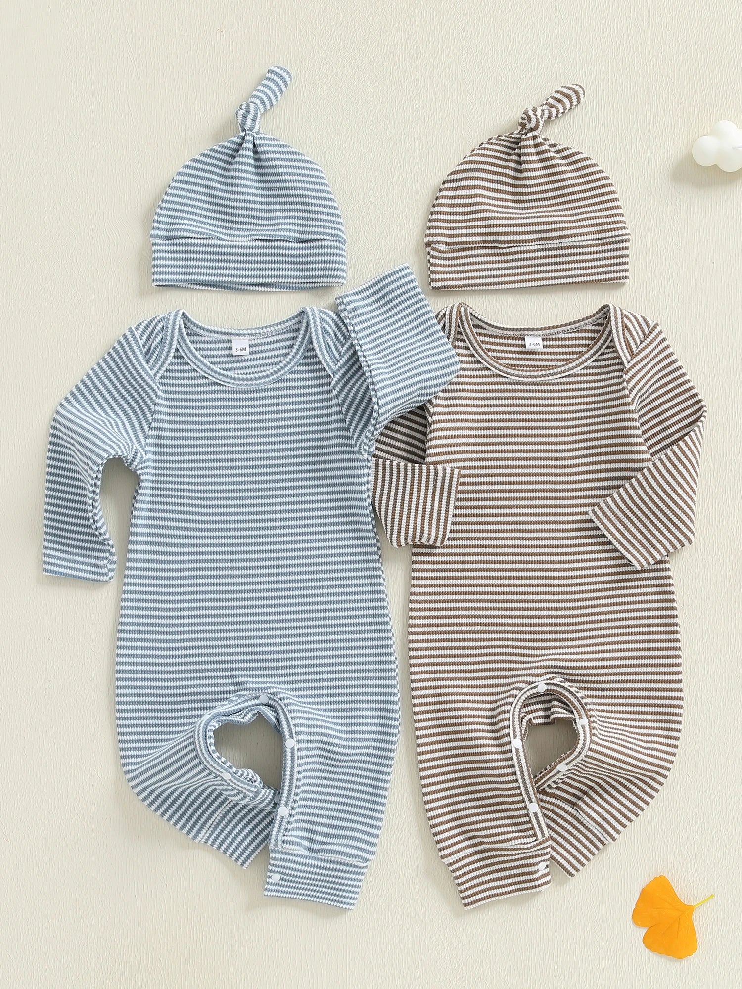 Baby Boy Fall Stripe Romper Long Sleeve Round Neck Full Length Jumpsuit with Hat