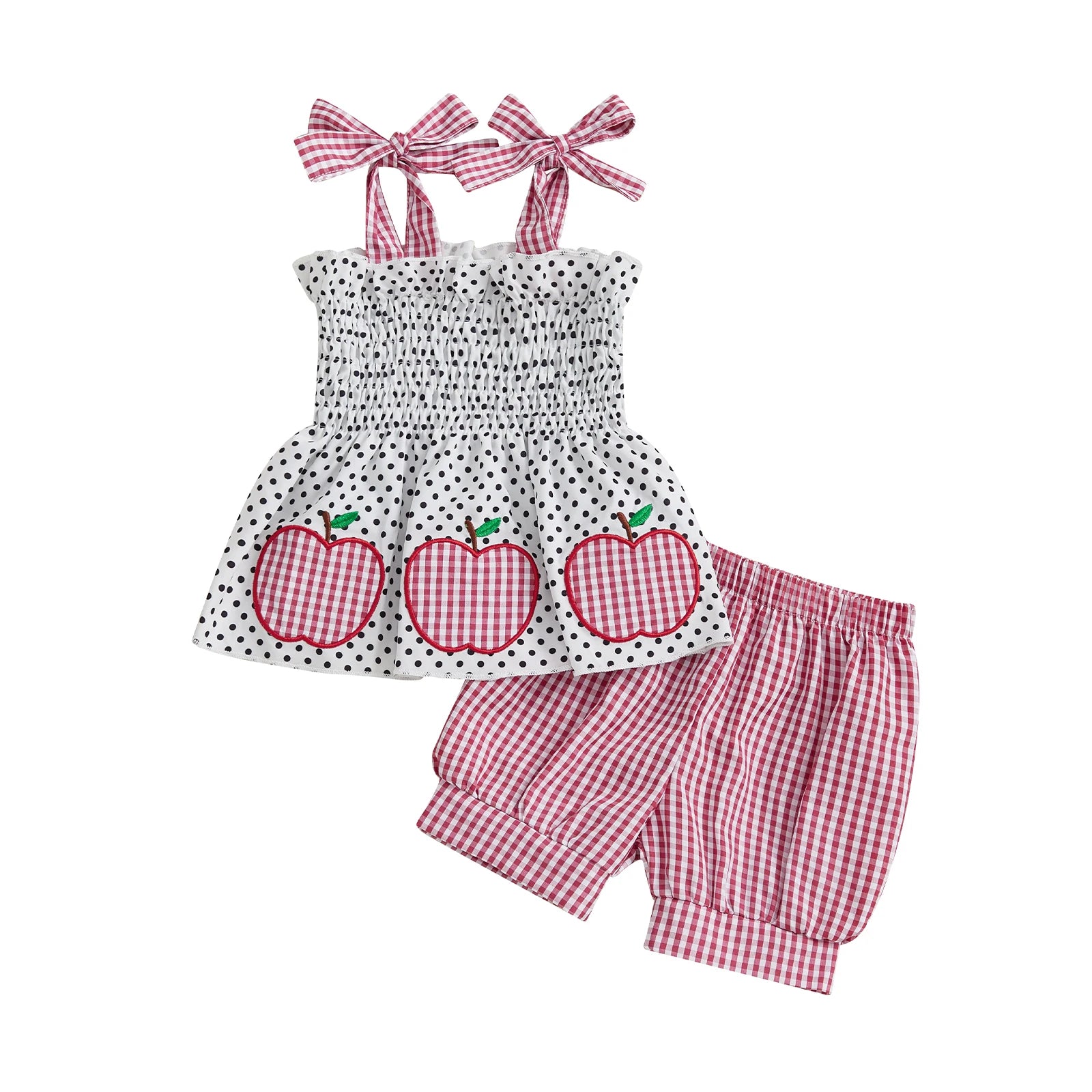 Kid Girl Summer Clothes Dot Print Smocked Tie-up Strap Camisole + Solid Color Shorts 2 Pcs Set