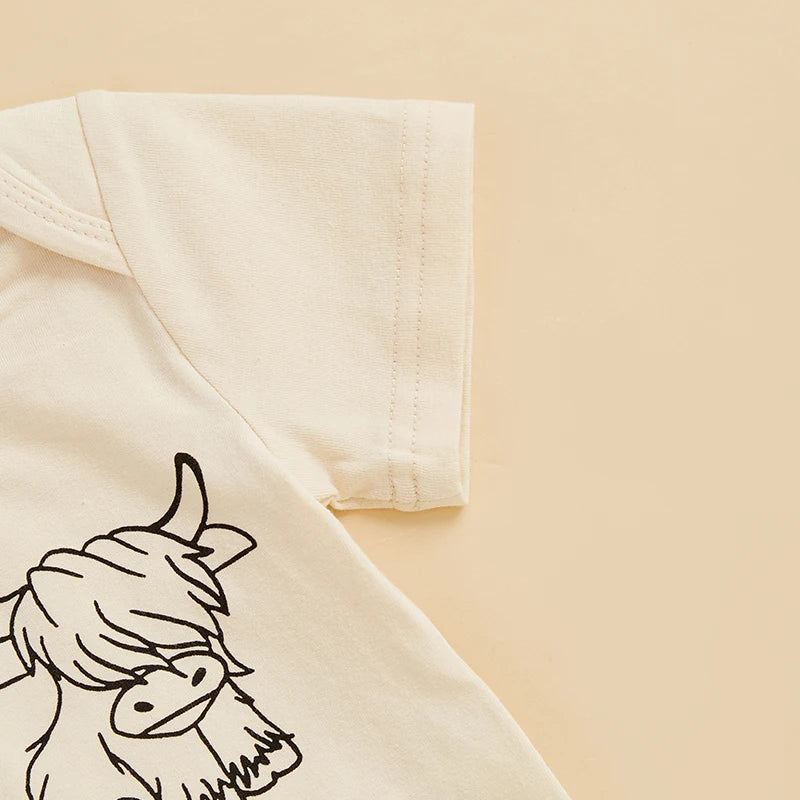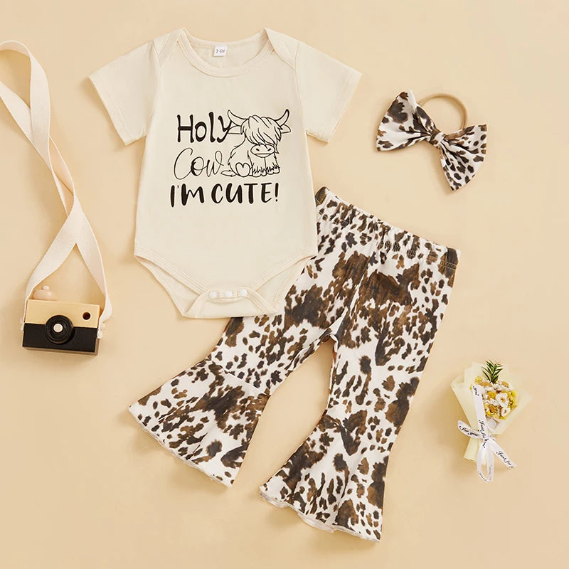 Baby Girls Summer Outfit, Short Sleeve Letters Cow Print Romper with Spots Print Flare Pants and HeadbandThis pants set is a good combination of comfy and style, gives your baby girl a happy summer!